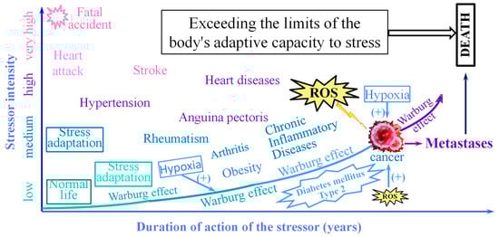 Thus, under hypoxic conditions, overstressed cells, which receive less oxygen than necessary, undergo anaerobic fermentation to produce adenosine triphosphate (ATP). This process is associated with excessive multiplication and, ultimately, tumour growth. Indeed, severe hypoxia due to profoundly low arterial O2 content (hypoxemia) results in hypercapnic and metabolic acidosis, developed together with extensive lactate generation, with pH decreasing to under 6.8 [224]. Because hypoxia is dependent on the magnitude and duration of action of the causative factors, human and animal organisms can only compensate for hypoxia if the causative agents stop acting for a long time. Normally, various stress agents, such as physical and chemical stressors, viruses, other infectious agents, hormones in excess, but also, long-lasting anxiety, emotions, conflict states, etc., are able to affect the body as a whole [225,226,227,228,229,230].