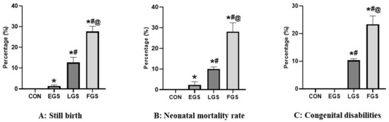 Congenital disabilities are any structural or physiological abnormality present at birth that develops before or during birth. The newborn pups were carefully inspected for congenital disabilities, and the percentage of congenital disabilities was calculated as follows: