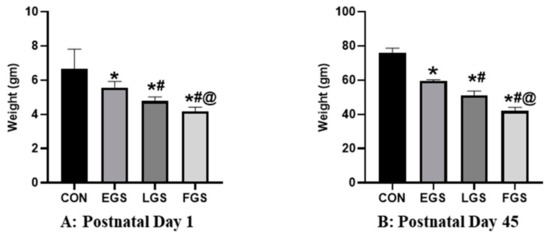 During delivery and after 45 days of postnatal life, the body weight of newborn pups in all experimental groups was measured. The body weights of infant pups were compared among all experimental groups on the day of delivery. Additionally, newborn pups’ body weights were compared among all experimental groups on the 45th postnatal day.
