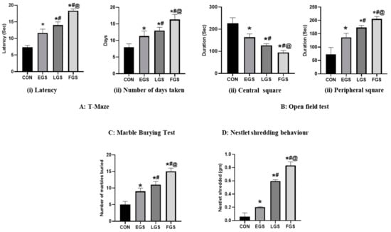 Maternal noise exposure alterd the offspring’s neurobehavior, including impaired spatial learning and memory, increased fear, anxiety, and repetitive behavior (Figure 3). In this study, the results of the T-maze showed increased latency and number of days taken to make the correct choice in EGS- and FGS-group animals compared to the control and LGS animals (Figure 3A). The EGS group’s (11.6 ± 1.15) latency significantly increased compared to the control (7.3 ± 0.57) and LGS (14 ± 1), and the FGS group’s (18.4 ± 0.48) latency was significantly higher than the EGS group. Similarly, the number of days the EGS (11.3 ± 1.5) group took increased compared to the control (8 ± 1) and was lesser than the LGS group (13 ± 1) and FGS group (16.6 ± 1.52). In the open-field test, the EGS group (16.3 ± 15.2) showed decreased time spent in the central square when compared to the control (226.6 ± 25.1), and increased time compared to the LGS (126.6 ± 7.63) and FGS group (94.3 ± 9.29). The LGS- (173.6 ± 7.6) and FGS-exposed animals (205 ± 9.2) showed an increased time spent in peripheral squares compared to the control (73.3 ± 25.12) and EGS animals (136.6 ± 15.2), which increased the fear and anxiety of the animals (Figure 3B). In the marble burying test, the number of marbles buried was higher in the LGS (11 ± 1) and FGS (15 ± 1) groups compared to the control (5 ± 1) and EGS (9 ± 1) groups. Compared to the control, the number of marbles buried by the EGS group was significantly higher, while the number buried by the LGS and FGS groups was lower (Figure 3C). In the NST, the amount of cotton shredding was significantly increased in the LGS (0.59 ± 0.02) and FGS groups (0.83 ± 0.05) compared to the control (0.06 ± 0.05) and EGS (0.20 ± 0.007) groups (D).