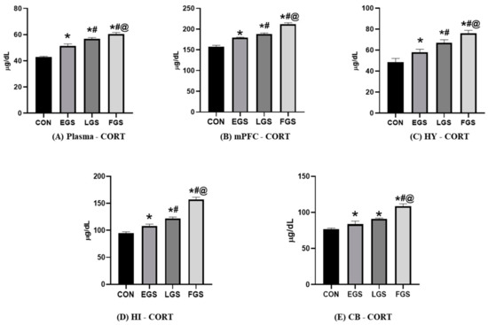 The CORT level (Figure 4) in plasma was significantly increased in the LGS (56.92 ± 0.7) and FGS (60.41 ± 1.3) groups compared to the control (42.94 ± 0.5) and EGS (51.34 ± 1.5) group animals. The CORT level in the mPFC was significantly increased in EGS (179 ± 1.4), LGS (188 ± 2.8), and FGS (212 ± 2.7) compared to control (157 ± 3.5). Similarly, the CORT level in the CB was significantly higher in the EGS (83.6 ± 4.3), LGS (91.2 ± 0.9), and FGS (108.2 ± 3.6) groups when compared to the control (76.8 ± 1.4). The CORT level in the HI was significantly increased in the LGS (122.7 ± 1.7) and FGS (157 ± 4.2) groups compared to the control- (94.2 ± 3.1) and EGS (107.8 ± 3.7)-group animals. Additionally, the CORT level in the HY was significantly increased in the EGS (58 ± 2.8), LGS (66.5 ± 2.1), and FGS (77 ± 1.4) compared to the control (48.5 ± 3.5). The LPO level (Table 2A) was significantly increased in the FGS group compared to the control-, EGS-, and LGS-group animals. The mPFC and hippocampus LPO levels were increased compared to the control-, EGS-, and LGS-group animals. There was no significant change in LPO level in the hypothalamus and cerebellum. The SOD level (Table 2B) in the hypothalamus was shown to be increased significantly in the control group when compared to the EGS, LGS, and FGS groups. In comparison, the prefrontal cortex, cerebellum, and hippocampus were insignificant. The catalase level (Table 2C) was significantly altered in the mPFC and hippocampus and no significant change in the hypothalamus or the cerebellum was observed in all experimental groups.