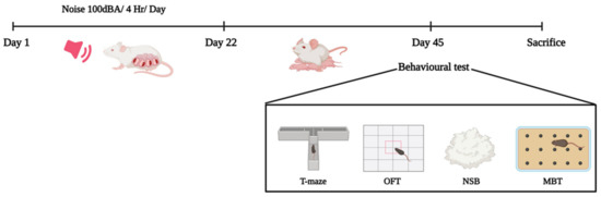 Three female rats were allowed to mate with one fertile, sexually active male rat for one night. The following day, the vaginal plug was collected from the females. A vaginal smear was prepared and examined under a microscope for the presence of sperm. The presence of sperm confirmed pregnancy; that day was recorded as “day zero” of pregnancy. The pregnant rats were then housed individually in separate cages. Animals were randomly divided into four groups (n = 6) and used for the experimental studies. The pregnant rats were exposed to noise stress using a noise-induction chamber for four hours daily. Male progeny (n = 6) were used for this experimental study. There were three groups of pregnant rats exposed to noise during gestation, as well as a control group: early gestational stress (EGS), which occurs between the 1st and 10th days of pregnancy; late gestational stress (LGS), which occurs between the 11th day and the delivery day, and full-term gestational stress (FGS), which occurs during the entire pregnancy period. After the 45th postnatal day, infant pups were tested using the T-maze test, marble-burying test (MBT), open-field test, and nestlet-shredding-behavior test (NST), and sacrificed (Figure 5).