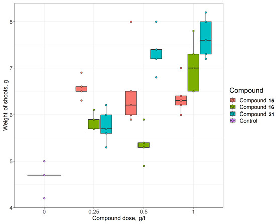 Plant growth stimulating activity of compounds 15–20 in corn seeds (Krasnodarsky 291 AMV cultivar) [86]. Experiments were carried out in two parallels: compounds 15, 16, 21 and the control; and compounds 17, 18, 19, 20, 22, 23 and the control.