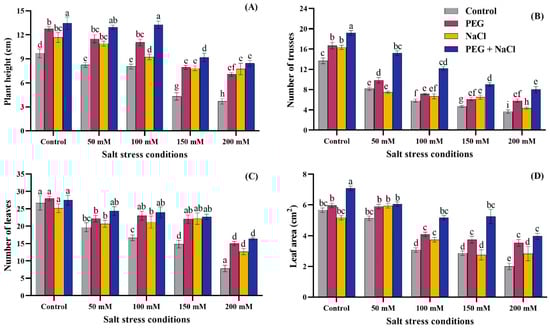 Impact of seed priming on plant height (A), number of trusses (B), number of leaves (C), and leaf area (D) of tomato plants subjected to varied salt stress conditions. The bars with the same alphabetical letters did not differ significantly, based on ANOVA followed by the Tukey test at 5%.