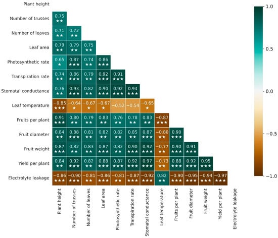 Correlation analysis of growth and physiological parameters. Stars show the significance level of the values. The stars represent significance level. *** for p < 0.001, ** for p < 0.01 and * for p < 0.1.