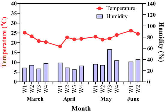 This experiment was carried out within the controlled environment of the Greenhouse of Laboratory Horticultural Science at Tokyo University of Agriculture, located in Setagaya Campus, Tokyo, Japan. The plant material chosen for this investigation was Micro Tom (wild type) seeds. The experiment was structured as a factorial completely randomized design (CRD), encompassing five different salinity treatments and four priming treatments. Each unique combination was replicated ten times, with an individual plant considered to be one replication unit. In total, this research involved the cultivation and measurement of parameters in 200 plants. The details of greenhouse temperature and humidity are illustrated in Figure 6, which were both measured on a weekly basis for four months until harvest stage was completed.