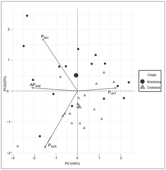 The multivariate analysis showed that brachiaria presented higher P immobilization in the microbial biomass, acid phosphatase activity, and P accumulated in the shoot, compared to crotalaria. This might be due to the fact that brachiaria is a grass with a fasciculate root system, which may help to explore high soil volumes and the exudates may enhance microbial activity [].