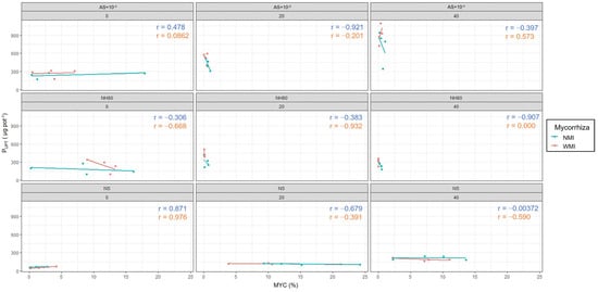 Relationship between P uptake (PUPT) and mycorrhization rate (MYC) from samples taken after cropping with brachiaria in soils subjected to three soil microbial communities: three P rate application and mycorrhiza inoculation. Treatment abbreviations are as follows: autoclaved soil followed by re-inoculation with dilution from the natural soil (10% w/v of natural soil) (AS + 10−3); soil heated at 80 °C for 1 h (NH80); and natural soil without manipulation (NS); P fertilizer was applied as triple superphosphate at the following rates: 0; 20; and 40 mg kg−1 of P; mycorrhiza inoculation: non-mycorrhiza inoculation (NMI) and with mycorrhiza inoculation (WMI).