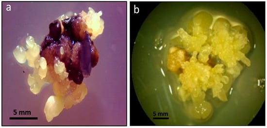 To induce secondary or recurrent embryogenesis (Gomez-Garay et al., 2014a) [57], the embryos were transferred to basal SM medium supplemented with 500 mg/L glutamine (SM + Gln medium). This medium consisted of Sommer et al.’s (1975) [58] macronutrients and Murashige and Skoog’s (1962) [59] micronutrients. The initial three months of culture in SM + Gln medium were conducted under photoperiod conditions of 16 h of light and 8 h of darkness, at a temperature of 20 ± 1 °C. Subsequently, the embryos were maintained in darkness throughout the experiment and subcultured on fresh SM + Gln medium every 30 days during the proliferation phase.