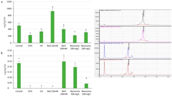 Among all the abiotic stress treatments, including high temperature (35 °C), UV radiation, moderate osmotic/saline stress (50 mM NaCl), severe osmotic/saline stress (200 mM NaCl), and exposure to nanoceria at concentrations of 100 mg/L and 200 mg/L, positive results for chlorogenic acid presence were observed. Furthermore, the presence of serotonin, another important compound, was detected in all the abiotic stress treatments, as well as in the control group (Table 2).