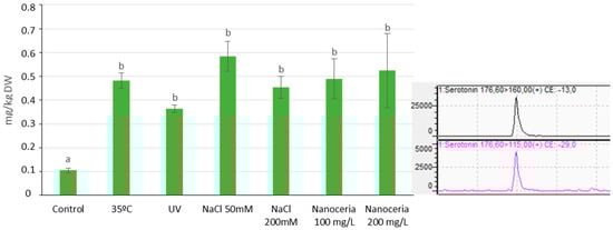 Serotonin content (mg/kg dry weight, DW) measured by LC-QQ-MS in Quercus suber somatic embryos subjected to different abiotic stress treatments: high temperature (35 °C), UV radiation, moderate osmotic/saline stress (50 mM NaCl), severe osmotic/saline stress (200 mM NaCl), and cerium oxide nanoparticles (nanoceria) at concentrations of 100 mg/L and 200 mg/L in the culture medium. Treatments sharing the same letter were not statistically significant at the 0.05 level, as determined by Duncan’s test. The inset on the right shows the chromatograms of serotonin detection in control sample under two different collision energies (CE: −13.0 and −29.0), highlighting the transition from m/z 176.60 to 160.00 (black) and m/z 176.60 to 115.00 (pink).