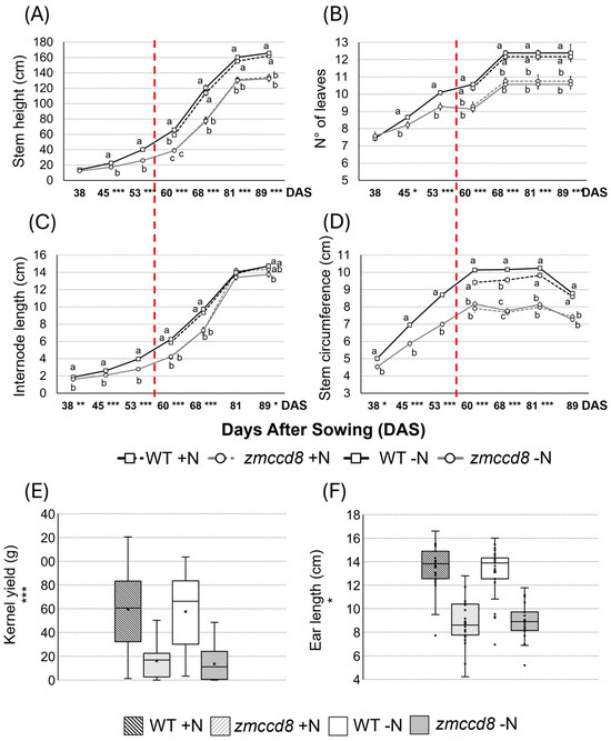 Phenotypic analysis of stem height (A), leaf number (B), internode length (C), stem circumference (D), kernel weight (E), and ears length (F) for wild-type (WT) and zmccd8 mutant plants at different days after sowing (DAS) under two N treatments. Error bars represent the mean ± SE (n = 24). At 58 DAS, urea was provided as the N source (dashed red line). Different letters indicate significant differences (at p < 0.05 according to LSD test) at each DAS. Based on ANOVA, the significance of F values was reported as follows: ‘***’ p < 0.001; ‘**’ p < 0.01; ‘*’ p < 0.05; no asterisks p > 0.05.
