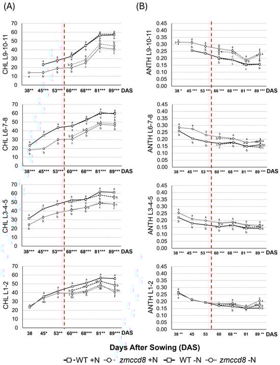 Chlorophyl (CHL) and anthocyanin (ANTH) contents were evaluated in each leaf of WT and zmccd8 maize plants at different time points after sowing (DAS), with leaf 1 being the closest to the ground, leaf 2 immediately above, and so on until leaf 11. Therefore, leaves 9 to 11 were the youngest. Data are shown for the groups of leaves (L1-2, L3-4-5, L6-7-8, and L9-10-11), grouped according to their similar behaviours in pigment content (Figure 2). An increasing trend in CHL was observed over time (Figure 2A). WT consistently showed higher CHL levels than zmccd8, particularly from 60 DAS in L1-2 (+20%), and as early as 38 DAS in L3-4-5 and L6-7-8 (+45%). In younger leaves (L6-7-8), WT plants exhibited significantly higher CHL levels from the beginning of the experiment, independently from fertilisation, thus suggesting that zmccd8 may have difficulty remobilising N to young leaves. Following urea provision (58 DAS), WT maintained consistent CHL levels even under N deficiency (-N) in young leaves (L9-10-11), whereas zmccd8 showed a small but significant decrease in CHL value (−10%) compared to those plants fertilised with N (zmccd8 +N), a difference that remained constant at 81 and 89 DAS. In older leaves, no differences between genotypes were observed.
