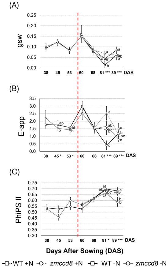 The maximum levels of gsw and E-app were observed at 60 DAS, which occurred a few days after N-fertilisation with urea in all leaf groups. Up to 68 DAS, the behaviour of the two genotypes was highly similar. However, at 81 DAS, substantial differences begin to emerge; specifically, a significant reduction in gsw was observed in WT plants grown without N (-N) when compared to the mutant (Figure 3A). Similarly, a significant reduction in the leaf transpiration rate (Figure 3B) and PSII efficiency (Figure 3C) was observed in WT plants subjected to N-deficiency, while no alterations in these parameters were noted in zmccd8 plants under the same conditions. Photosystem II efficiency increased in both genotypes until 81 DAS (Figure 3C). While these levels remained constant at 89 DAS in the WT, they decreased in the zmccd8. In this case, the behaviour of the two genotypes was not affected by N-fertilisation. These results indicate that zmccd8 is impaired in its ability to implement a secondary mechanism of protection from drought stress in response to N-deficiency, leading us to hypothesise the existence of a crosstalk between N-starvation and water stress response in maize that might depend on SLs.