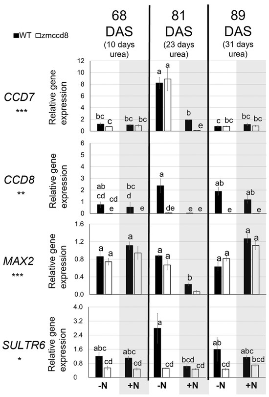 The expression of two genes involved in SL biosynthesis (CCD7, CCD8) and one gene involved in SL signalling (MAX2) was analysed in the WT and zmccd8 leaf samples of plants supplied or not supplied with urea after 10, 23, and 31 days, corresponding to 68, 81, and 89 DAS, respectively (Figure 4). As expected, CCD8 displayed no expression in the zmccd8 samples. After 10 days (68 DAS), no significant differences were observed in response to nutritional conditions (-N vs. urea) or between genotypes. After 23 days (81 DAS), a clear upregulation of the CCD7 expression in both genotypes and of CCD8 expression only in the WT in response to N-deficiency was observed. MAX2 showed no significant variations in its expression at 81 DAS compared to 68 DAS. No statistical differences were detected in the expression of the three genes at 89 DAS (31 days after urea supply), between genotypes, or between nutritional treatments.