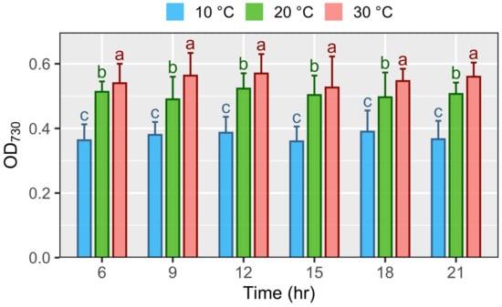 OD730 variations for the diurnal changes in light intensities at different temperatures. The vertical bar represents the standard deviation. Values are the mean + standard deviation (n = 3). Bars with similar letters are not statistically different, as per the two-way ANOVA followed by Tukey’s post hoc test (p < 0.05).