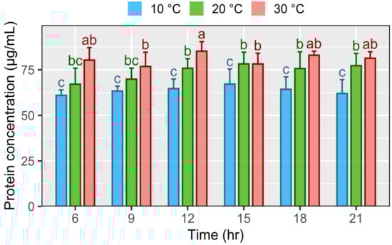 Diurnal changes in protein concentration at different temperatures. Vertical bar indicates standard deviation. Values are mean + standard deviation (n = 3). Bars with similar letters are not statistically different, as per two-way ANOVA followed by Tukey’s post hoc test (p < 0.05).