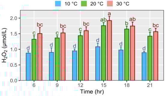 Diurnal changes in H2O2 concentration at different temperatures. Vertical bar stands for standard deviation. Values are mean + standard deviation (n = 3). Bars with similar letters are not statistically different, as per two-way ANOVA followed by Tukey’s post hoc test (p < 0.05).