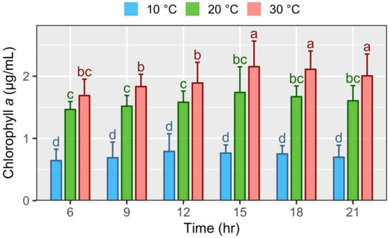 Diurnal changes in Chl a concentration at different temperatures. Vertical bar represents standard deviation. Values are mean + standard deviation (n = 3). Bars with similar letters are not, statistically different as per two-way ANOVA followed by Tukey’s post hoc test (p < 0.05).
