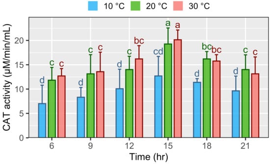 Diurnal changes in CAT activity at different temperatures. Vertical bar represents standard deviation. Values are mean + standard deviation (n = 3). Bars with similar letters are not statistically different, as per two-way ANOVA followed by Tukey’s post hoc test (p < 0.05).