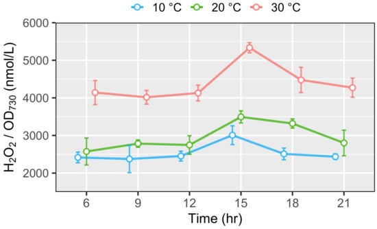 Diurnal changes in H2O2/OD730 at different temperatures. Vertical bar indicates standard deviation.