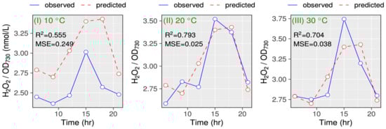 The correlation between observed and predicted values using LM for P. foetida (H2O2/OD730) at 30 °C, 10 °C, and 10 °C.