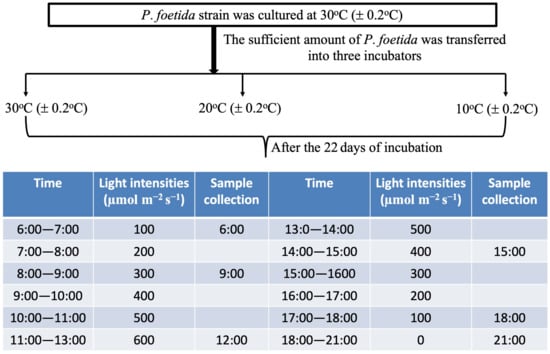 Cultures were first grown at 30 °C, and then transferred to 30 °C (±0.2 °C), 20 °C (±0.2 °C) (for 2 days), and 10 °C (±0.2 °C) (for 4 days) conditions, for a total incubation time of 22 days held at their final temperature at 20–30 µmol m−2 s−1 photosynthetically active radiation (PAR) (Apogee, MQ-200, Logan, UT, USA) levels. In order to reduce temperature stress and enable gradual adaptation, a stepwise transition was performed. Following dilution, the number of sufficient cells of P. foetida was adjusted by adding 10 mL of inoculum (P. foetida cells) to 110 mL of BG11 medium (1:12 dilution ratio). A 300 mL Erlenmeyer flask (AS ONE Corporation, Osaka, Japan) was used for culture maintenance, so that gas exchange was adequate to aerate the culture, with 180 mL of extra space, thereby preventing oxygen limitation (advanced shaking) and avoiding the possibility of CO2 limitation. The diurnal PAR variations were monitored from 6:00 to 18:00 following the 22-day incubation period only once. The PAR was 0 µmol m−2 s−1 in the initial stage at 6:00. The PAR increased by 100 µmol m−2 s−1 per hour starting at 6:00 and reached its maximum between 11:00 and 13:00 at 600 µmol m−2 s−1. Then, the light intensity dropped off in tandem. At 18:00, it was 0 µmol m−2 s−1. The samples were collected for every three-hour interval at 6:00, 9:00, 12:00, 15:00, 18:00, and 21:00. Cultures were maintained in triplicate for each condition (for instance, at 6:00, three flasks were used) to ensure statistical reliability. Culture samples (1 mL) were centrifuged at 10,000× g for 10 min at 4 °C, and the supernatant was collected and kept at −80 °C until further analysis. The diurnal light changes at 30 °C, 20 °C, and 10 °C are shown in Figure 8.