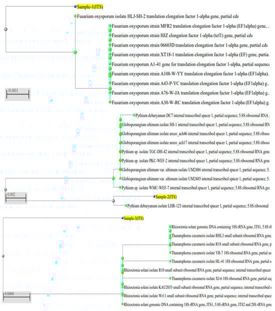 Three fungal species were isolated from diseased tomato plant samples with damping-off, root rot, and wilting, which were identified based on molecular identification. For sequence analysis, data compared with the 18S rRNA gene showed Fusarium oxysporum, Pythium debaryanum, and Rhizoctonia solani (Figure 1). The sequences of amplified ITS regions were submitted to GenBank and given accession numbers of KT224063 for F. oxysporum (Sample 1), OP823136 for P. debaryanum (Sample 2), and OP823124 for R. solani (Sample 3).