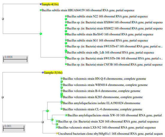 The phylogenetic trees identified for Bacillus subtilis OP823140 (Sample 4) and B. amyloliquefaciens OP823147 (Sample 5) by 16S rRNA amplification primers, compared with sequences retrieved from GenBank.