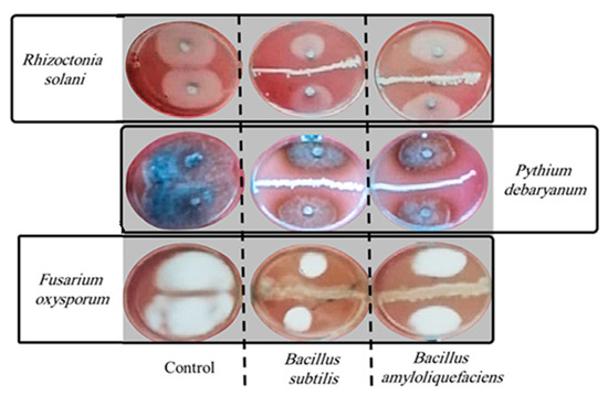 On the PDA medium, the effectiveness of B. subtilis and B. amyloliquefaciens was determined to inhibit R. solani, P. debaryanum, and F. oxysporum development in dual culture, for which the inhibitory effect was remarkable after 7 days of incubation (Table 1 and Figure 3). Generally, B. subtilis outperformed B. amyloliquefaciens in resistance to R. solani and F. oxysporum, which were recorded as 28.33 and 33.00 mm. In contrast, B. amyloliquefaciens caused the highest antagonistic effect against the tested P. debaryanum fungus.