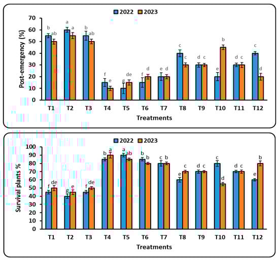 Impact of fungicide (Topsin-M70) and Bacillus strains on the post-emergence and plant survival % of tomato plants infected with Fusarium oxysporum, Pythium debaryanum, and Rhizoctonia solani. Values are means ± S.D (n = 3). Numbers within a row with different superscripts vary statistically (p ≤ 0.05). a–g: Duncan’s letters. SL: shoot length; RL: root length; SDW: shoot dry weight; RDW: root dry weight. T1: Seedlings grown in soil infested with F. oxysporum (3%); T2: Seedlings grown in soil infested with P. debaryanum (3%); T3: Seedlings grown in soil infested with R. solani (3%); T4: Seedlings dipped with Topsin-M70 (fungicide, 2 g L−1, 90 min) + Soil infested with F. oxysporum (3%); T5: Seedlings dipped with Topsin-M70 (fungicide, 2 g L−1, 90 min) + Soil infested with P. debaryanum (3%); T6: Seedlings dipped with Topsin-M70 (fungicide, 2 g L−1, 90 min) + Soil infested with R. solani (3%); T7: Seedlings dipped with B. subtilis (90 min) + Soil infested with F. oxysporum (3%); T8: Seedlings dipped with B. subtilis (90 min) + Soil infested with P. debaryanum (3%); T9: Seedlings dipped with B. subtilis (90 min) + Soil infested with R. solani (3%); T10: Seedlings dipped with B. amyloliquefaciens (90 min) + Soil infested with F. oxysporum (3%); T11: Seedlings dipped with B. amyloliquefaciens (90 min) + Soil infested with P. debaryanum (3%); T12: Seedlings dipped with B. amyloliquefaciens (90 min) + Soil infested with R. solani (3%).