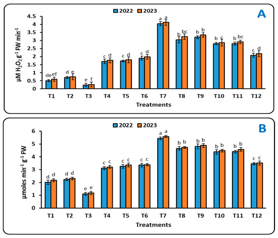 Utilizing the techniques outlined by [73], the conversion of pyrogallol to purpurgallin with H2O2 was evaluated to measure the peroxidase enzyme’s activity. In the sample cuvette, there was 3.0 mL of dH2O, 0.5 mL of 0.1M sodium phosphate buffer (pH 7), 0.3 mL of the extract (enzyme), 0.05 mL of pyrogallol, and 0.1 mL of H2O2 (10%). The peroxidase enzyme activity was assessed at 425 nm μM H2O2 g−1 FW min−1.