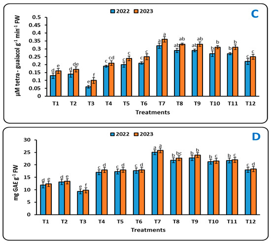 Impact of fungicide (Topsin-M70) and Bacillus strains on antioxidant enzymes PO (A), PAL (B), and PPO (C) and total phenolic content (D) of tomato plants infected with Fusarium oxysporum, Pythium debaryanum, and Rhizoctonia solani at 60 days from transplanting during 2022 and 2023 seasons. Values are means ± S.D (n = 3). Numbers within a row with different superscripts vary statistically (p ≤ 0.05). a–f: Duncan’s letters. SL: shoot length; RL: root length; SDW: shoot dry weight; RDW: root dry weight. T1: Seedlings grown in soil infested with F. oxysporum (3%); T2: Seedlings grown in soil infested with P. debaryanum (3%); T3: Seedlings grown in soil infested with R. solani (3%); T4: Seedlings dipped with Topsin-M70 (fungicide, 2 g L−1, 90 min) + Soil infested with F. oxysporum (3%); T5: Seedlings dipped with Topsin-M70 (fungicide, 2 g L−1, 90 min) + Soil infested with P. debaryanum (3%); T6: Seedlings dipped with Topsin-M70 (fungicide, 2 g L−1, 90 min) + Soil infested with R. solani (3%); T7: Seedlings dipped with B. subtilis (90 min) + Soil infested with F. oxysporum (3%); T8: Seedlings dipped with B. subtilis (90 min) + Soil infested with P. debaryanum (3%); T9: Seedlings dipped with B. subtilis (90 min) + Soil infested with R. solani (3%); T10: Seedlings dipped with B. amyloliquefaciens (90 min) + Soil infested with F. oxysporum (3%); T11: Seedlings dipped with B. amyloliquefaciens (90 min) + Soil infested with P. debaryanum (3%); T12: Seedlings dipped with B. amyloliquefaciens (90 min) + Soil infested with R. solani (3%).