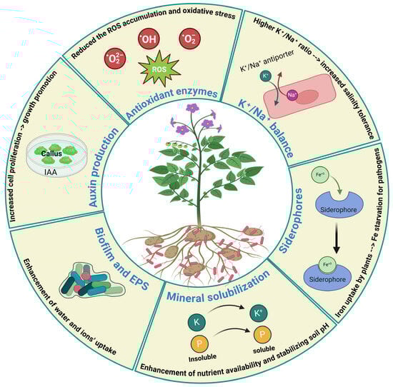 - Nawaz, A.; Qamar, Z.U.; Marghoob, M.U.; Imtiaz, M.; Imran, A.; Mubeen, F. Contribution of Potassium Solubilizing Bacteria in Improved Potassium Assimilation and Cytosolic K+/Na+ Ratio in Rice (Oryza sativa L.) under Saline-Sodic Conditions. Front. Microbiol. 2023, 14, 1196024. [Google Scholar] [CrossRef]