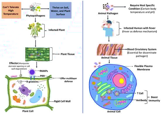 The natural barriers that segregate phytopathogens and animal pathogens play a critical role in preventing the spillover of diseases between plants and animals. The primary natural barrier lies in the fundamental structural and biological differences between plant and animal cells (Figure 1). Typically, plant and animal cells share fundamental structural similarities within the cytosol, with the exception of certain organelles, such as chloroplasts, that are unique to plant cells. However, plant cells are encased in rigid cell walls made of cellulose, hemicellulose, and lignin, which provide a strong physical barrier against pathogen entry [15,16]. In contrast, animal cells have more flexible plasma membranes, making them vulnerable to pathogens that use different modes of invasion. Furthermore, many animal pathogens depend on circulatory systems that are crucial for their propagation, dissemination, or colonization of the gut or bloodstream, which do not exist in plants [17,18].