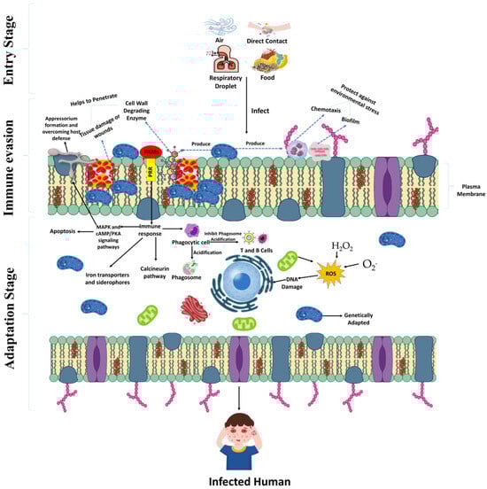 Pathogens specializing in plant or animal hosts have evolved highly specific virulence and survival strategies to colonize their primary hosts effectively. These adaptations are tailored to exploit the distinct physiological and immune characteristics of plants or animals. However, substantial physiological and immunological differences between these host systems generally act as natural barriers against cross-kingdom infections. To establish an infection in a non-primary host, a phytopathogen must overcome significant challenges, including adapting to an unfamiliar biochemical environment, evading immune responses, and acquiring the essential nutrients necessary for survival. Cross-kingdom pathogenesis typically involves three major stages: entry, immune evasion, and adaptation (Figure 2). Phytopathogens can enter the host via multiple transmission routes, such as airborne inhalation, direct contact, or ingesting contaminated food. Upon breaching the epithelial barrier—either through wounds or enzymatic degradation of host tissues—they engage in immune evasion strategies, including chemotaxis and biofilm formation, to persist within the host. Adaptation to the new host environment is facilitated by key molecular pathways, such as the mitogen-activated protein kinase (MAPK) and cyclic AMP/protein kinase A (cAMP/PKA) pathways, which regulate fungal penetration, appressorium formation, and responses to host-derived cues. Iron acquisition mechanisms, including siderophores and iron transporters, play a crucial role in nutrient competition with the host, ensuring pathogen survival. The calcineurin signaling pathway also helps phytopathogens endure environmental stress within nutrient-limited host conditions. These sophisticated adaptation strategies enable phytopathogens to bypass cross-kingdom barriers and successfully infect non-primary hosts. The ability of plant pathogens to exploit these mechanisms in human hosts poses a significant public health risk as it compromises the body’s ability to anticipate and mount effective immune defenses against these emerging threats.