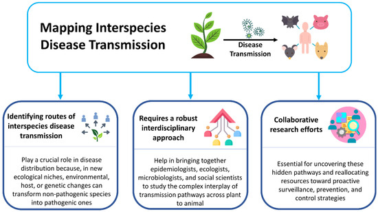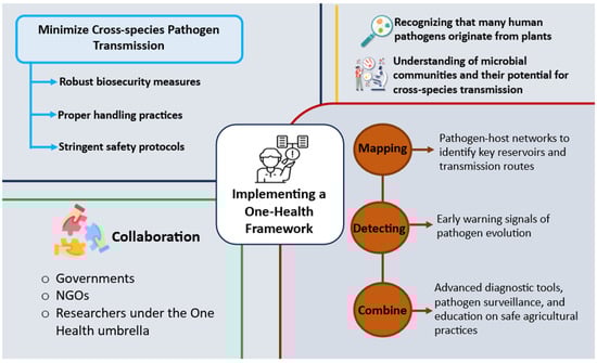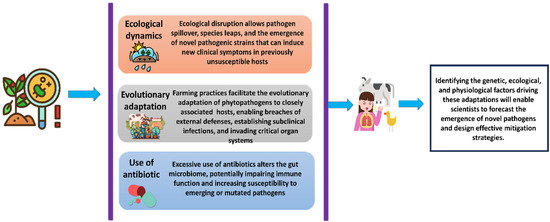 From the discussion above, it is evident that environmental stressors, including changes in temperature, moisture availability, and exposure to disinfectants, can induce genetic shifts in phytopathogens, increasing their tolerance to antimicrobial compounds and host immune defenses. These stress-driven adaptations further enhance their ability to infect nonprimary hosts, highlighting the critical role of environmental and anthropogenic factors in shaping pathogen evolution and cross-kingdom transmission.