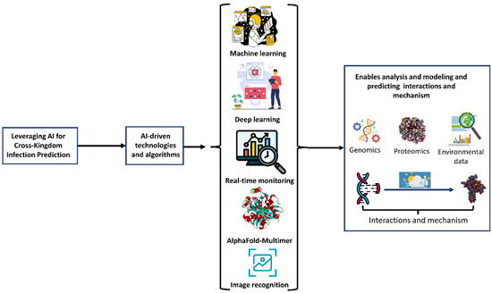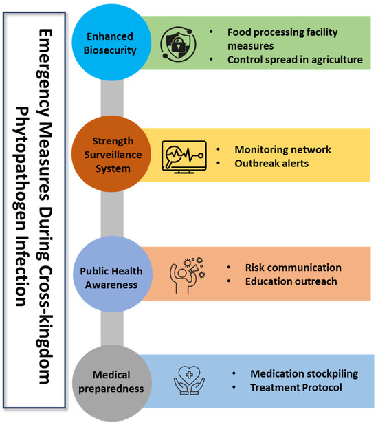 The drivers behind the emergence of cross-kingdom infections by phytopathogens are complex and multifactorial. Globalization, climate change, and intensive agricultural practices have intensified pathogen spread and diversity, increasing the likelihood of interactions between phytopathogens and non-plant hosts [4]. Global warming, for instance, alters the geographical distribution and lifecycle of many pathogens, enabling them to thrive in new environments, experience novel abiotic stresses, and encounter new hosts [1,6]. Furthermore, the increased use of broad-spectrum pesticides and antibiotics in agriculture and healthcare may inadvertently select resilient pathogen strains capable of surviving diverse conditions, including those within animal and human hosts [3,7]. Stress-induced adaptability in these pathogens, such as the ability to withstand oxidative stress and nutrient limitations, may further facilitate their survival and infection in new hosts. In parallel, the surge in international trade has facilitated the widespread distribution of plant pathogens to new regions, amplifying their chances to interact with animal and human populations [8,9].
