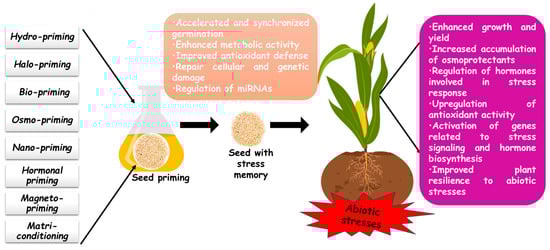 Cereal crops (wheat, rice, maize, and sorghum, etc.) are the cornerstone of global agriculture, accounting for >50% of the world’s caloric supply and the primary source of nutrition for billions of people, particularly in developing countries [1]. These cereals/grains are rich in nutrients such as carbohydrates, proteins, various dietary fibers, vitamins, and minerals, and are thus essential in human diets [2]. Besides direct human consumption, cereals are a critical source of animal feed (livestock) and raw materials for an industrial sector, highlighting their versatility [3]. Their wide adaptability enables them to be grown in various agroecological zones, and they are central to the sustainable development of global food systems [4]. Europe, America, and Asia produce nearly 80% of the world’s cereal grains comprising rice, sorghum, barley, rye, oats, millet, and wheat [5]. But increased demand from population growth and changing diets pose major challenges for agricultural productivity and sustainability. Addressing these challenges requires innovative strategies to enhance cereal yield and resilience, ensuring food security for the growing global population [5]. Despite their significance, cereal crops are highly susceptible to abiotic stresses, which are intensified by climate change [6]. These stresses significantly limit crop growth, yield, and quality, posing a serious threat to global food production [6]. In cereal crops, they disrupt key physiological processes such as photosynthesis, nutrient uptake, respiration, and reproduction, ultimately reducing productivity [7]. As a result, cereals produce excessive reactive oxygen species (ROS) due to incomplete reduction in molecular oxygen [8]. These ROS inflict oxidative damage on nucleic acids, lipid membranes, and cellular proteins, leading to irreversible dysfunction of metabolic structures and, ultimately, cell death [8]. Faced with escalating climate challenges, enhancing abiotic stress tolerance in cereal crops has become a pressing priority to safeguard global food security. While traditional breeding and genetic engineering have provided valuable tools, their limitations—such as long development timelines, high costs, and regulatory constraints—highlight the need for more immediate and accessible alternatives. Among these, seed priming has gained significant attention as a simple, cost-effective, and eco-friendly strategy to boost stress resilience in plants [9]. Seed priming involves controlled hydration of seeds to initiate early metabolic processes essential for germination, followed by re-drying to halt further development [10]. This pre-conditioning enables seeds to “memorize” the priming stimulus, thereby enhancing their physiological preparedness to face environmental stress upon sowing [11]. Such stress memory is orchestrated by a suite of molecular and biochemical changes, including hormonal modulation—particularly of abscisic acid (ABA) and gibberellic acid (GA)—alongside ROS signaling and transcriptional reprogramming of stress-responsive genes [9,12]. Emerging evidence also points to a role for epigenetic modifications, such as DNA methylation and histone remodeling, in sustaining these priming effects across developmental stages [13]. A wide range of priming techniques have been developed, each tailored to specific stress contexts and crop species. These include hydropriming (water), osmopriming (using osmotic agents like PEG), halopriming (salt solutions), hormonal priming (e.g., with salicylic or gibberellic acid), biopriming (with beneficial microbes), magnetopriming, matriconditioning, and nanopriming (using nanoparticles) [14]. These methods enhance germination rates, improve seedling vigor, and prime the expression of key stress-related genes, particularly those involved in antioxidant defense, ion homeostasis, and photosynthetic efficiency [9,12,13,15]. In this context, seed priming stands out as a promising approach to enhance cereal crop performance under abiotic stress. Its multifaceted impact on molecular pathways, hormonal dynamics, and epigenetic stability positions it as a valuable tool in sustainable agriculture, especially in regions vulnerable to extreme environmental conditions. The objective of this review is to provide a comprehensive examination of the mechanisms underlying seed priming in cereal crops, with a particular focus on its role in enhancing resilience to abiotic stress. By exploring the molecular, physiological, biochemical, and transcriptomic responses to seed priming, this review aims to highlight the potential of this strategy for improving cereal crop productivity and stress tolerance in the face of climate change.