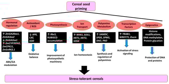 Seed priming in cereal crops activates a complex and multilayered molecular network that enhances tolerance to abiotic stresses. This network involves a coordinated interplay between hormonal regulation, redox homeostasis, transcriptional reprogramming, and epigenetic modifications [12]. Rather than acting through isolated mechanisms, these interconnected responses precondition seeds to respond more efficiently and robustly to environmental challenges, ultimately enhancing seedling vigor and crop establishment (Figure 2). A central mechanism through which priming confers stress tolerance is hormonal modulation, especially the dynamic balance between ABA and GA, two key regulators of germination and stress signaling. In maize, for instance, priming with SA and H2O2 under chilling stress promotes GA biosynthesis by upregulating ZmGA20ox1 and ZmGA3ox2, while simultaneously downregulating the catabolic gene ZmGA2ox1. This hormonal shift favors GA accumulation, enhancing germination and early growth. At the same time, ABA catabolism is stimulated through ZmCYP707A2, and its signaling is fine-tuned via ZmCPK11 and ZmSnRK2.1, thus alleviating ABA-mediated inhibition [116]. In rice, PEG priming under nano-ZnO stress has shown to improve growth, reduce oxidative stress markers such as MDA, and lower antioxidant enzyme activities (SOD, POD, CAT). The reduced expression of antioxidant-related genes (APX, CAT, SOD) suggests that primed plants are better preconditioned and less reliant on stress-induced responses. Structural integrity in mesophyll and root tissues was also preserved, as evidenced by ultrastructural analysis [117]. Under salinity stress, polyamine-based priming enhances both enzymatic and non-enzymatic antioxidant systems. This includes upregulation of RbcS and accumulation of RUBISCO, improving photosynthetic performance. Additionally, stress-related transcription factors (TRAB1, WRKY71, Osem), ABA biosynthesis (NCED3), and ion transport (NHX1) genes are upregulated, contributing to hormonal and ionic homeostasis. Polyamine metabolism is also stimulated through increased expression of SAMDC, SPDS, SPMS, DAO, and PAO, providing metabolic support for adaptation [118]. In wheat, seed priming leads to the strong induction of salt-responsive genes such as TaNHX1, TaSOS1, TaSOS4, TaHKT1, and TaHKT2, which are involved in ion transport, photosynthetic pigment biosynthesis, and oxidative stress mitigation [119]. Similar responses occur in rice, where OsSOS1, OsNHX1, and OsHKT1 contribute to ionic balance and stress tolerance under saline conditions [120]. Beyond stress perception and early seedling responses, seed priming also influences seed maturation and storage. During desiccation, their chromatin structure is at risk due to changes in DNA helical conformation. Priming helps mitigate desiccation-induced damage through epigenetic mechanisms such as histone modifications, DNA methylation, and protein glycation. These processes preserve DNA and protein integrity, playing a protective role in seed longevity and viability [121].