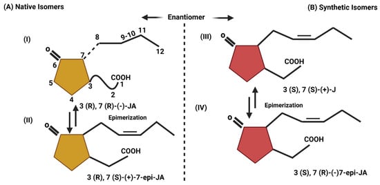 Overview of four stereoisomers of JA: this figure was adapted according to [] with minor modifications (A,B) to represent native and synthetic isomers of JA.