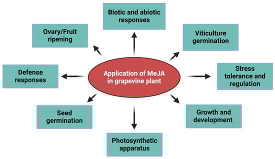 The MeJA is a steroidal phytohormone, which is responsible for fruit ripening, biotic and abiotic tolerance, seed germination, defense response, growth and development, dormancy rate, and phenolic composition, etc. (Figure 2) [,,,]. MeJA has been linked to the regulation of grape berries and is thought to be the primary regulator of fruit ripening []. It carries a pivotal role in the stress responses of the grape. For instance, metabolic regulation, hormonal biosynthesis, alkaloid formulation, and fruit quality []. MeJA has shown a great influence on “table grape” grape maturation and berries standard via bioactive compounds, which depend upon accessible doses []. MeJA revealed its significance as an adaptable carrier, including biotic and abiotic stress responses; thus, it is an endogenous messenger at various levels of sustainable growth. MeJA enhanced the resistance of vinery grafting and cultivation management in response to abiotic stress with Cabernet Sauvignon cultivar []. MeJA was considered to be the most blessing hormone in grape plant growth, which improved physiological responses []. MeJA elevates an essential role in plant acclimation to the genomic levels association with abiotic via biotic stresses related genes, proteins (DNA, RNA, and mRNA), transcription factors, and enzymes with defense mechanisms []. Therefore, such applications might be eco-friendly, simpler, time-saving, and logical schemes for enhancing morphological, biochemical, anatomical, ecological, and genetic indicators for grape varieties, thereby elevating economic growth and wine quality.