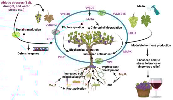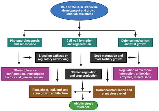 MeJA plays different roles in the developmental progress of grapes under abiotic stress (Figure 3) [,]. For instance, photomorphogenesis, senescence, cell wall formation, regeneration, defense mechanisms, fruit growth, plastidial signaling pathway, regulatory network, and seed maturation []. Male fertility growth, increased metabolism, sex determination, and cell division []. Root growth, flower development, inflorescence, seed growth, shoot elongation, and abiotic stress tolerance []. It plays a diverse role in hypocotyl elongation, the ripening process, ethylene-related responses, signaling regulations, post-harvest disorders, and softening of fruits []. Furthermore, it maintained galactose metabolism, plant hormone signal transduction, chlorophyll metabolism, flavonoid biosynthesis, diterpenoid biosynthesis, and secondary metabolism []. In addition, it also maintained carotenoid biosynthesis, photosynthesis, cellular respiration, nitrogen (N) metabolism, carbon fixation in higher organisms, and terpene biosynthesis []. Moreover, ABC transporters, mitogen-activated protein kinases (MAPK-signaling), biosynthesis of unsaturated fatty acids, amino sugar, and natural defense mechanisms were generated for better cultivation and development of plants []. On the other hand, diverse tolerance responses were involved, including energy metabolism, environmental adaptation, signal transduction, cellular protein modification process, and response to external stresses []. Interestingly, fruit development [] and disease resistance investigations were observed []. MeJA in ‘Cabernet Sauvignon’ leads to a better influence on stilbene production in grapes []. In grapes, reactive oxygen species (ROS) and trans-resveratrol were enhanced under MeJA [].