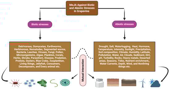 Abiotic and biotic stresses have detrimental effects on growth and lead to a potential crop reduction in grapes (Vitis vinifera L.) []. They perturbed a wide series of host species, including grapes, horticultural crops, ornamental fruits, and agricultural sectors around the world []. There are essential challenges in biotic and abiotic stress control due to their complex life, growth phases, winery production, climate change, soil deprivation, insufficient water availability, heavy metals, and potential to reproduce biologically, making them incredibly challenging to manage during harsh environments [,,]. These stresses commonly exhibit symptoms including defoliation, leaf yellowing, poor growth, significant economic loss, water deficit, dysfunction of cellular organelles, imbalance in mineral ions, reduced hormonal performance, disturbance in photosynthesis, stress protectors, reduced oxidative damage, osmoprotectants, senescence and even death of the grapes [,]. Study shows that biotic and abiotic stresses lead to a worldwide grape reduction in major vineyard production by 10–25%, which was predicted to elevate 15–40% for every degree of increase in worldwide temperature due to global warming [].