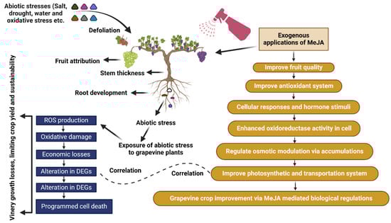Grape leading economic losses against abiotic stresses (salt, drought, water, and oxidative stress) and plant improvement under exogenous applications of MeJA.