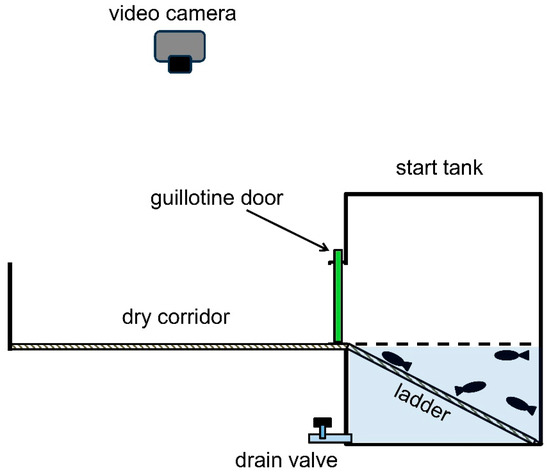 The experimental apparatus was used to estimate the differences in biochemical parameters of climbing perch in aquatic environments and during terrestrial movements (Figure 1). The apparatus was a reduced version of a dry labyrinth [9] and consisted of two adjacent opaque white plastic tanks: a start tank and a dry corridor. The start tank measured 40 × 40 × 60 cm (length × width × height) and had a 20 × 20 cm entrance to the dry corridor, positioned 20 cm above the bottom. A ladder extended across the entire bottom of the start tank, leading to the entrance at a 27° angle. A guillotine door closed the entrance from the start tank to the dry corridor. A drain valve near the bottom of the start tank was used for water control. The dry corridor measured 80 × 20 × 20 cm (length × width × height). The ladder and the bottom of the corridor were covered with yellowish fabric to increase adhesion for the terrestrial movement of the climbing perch. A video camera (GoPro HERO 8 Black, GoPro Inc., San Mateo, CA, USA) with remote control was mounted above the apparatus to enable real-time monitoring of the fish without visual contact. We propose that the corridor section in the apparatus is essential for providing fish with a stimulus and serving as a signal for terrestrial movement, which would be difficult to detect in a single-section setup (start tank).
