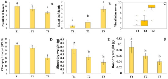 Responses of shoot traits and root dry weight of rapeseed genotypes to three different treatments: T1 = control, T2 = 8 dSm−1 salt stress, and T3 = 8 dSm−1 salt + 0.1 mM salicylic acid. (A) No. of leaves, (B) no. of leaf deaths, (C) visual injury scores, (D) chlorophyll content (SPAD unit), (E) shoot dry weight (g), and (F) root dry weight (g). Each data point (yellow bar) represents the average of 45 observations. Vertical bars indicate standard error; different letters denote significant differences. Total sample number, n = 135. As the visual injury score (C) was non-parametric data, boxplot was included for each treatment.