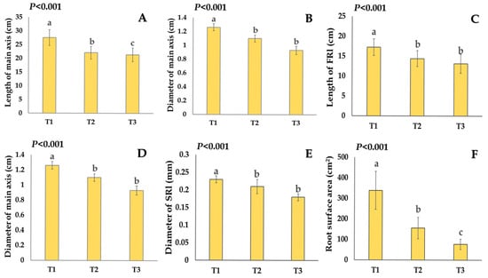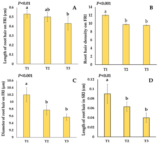 Salinity stress (T2) significantly reduced the diameter of individual root hairs and the number of root hairs formed per unit area (density) of first-order lateral roots (Figure 2B,C). This stress also reduced the length of the root hairs on second-order lateral roots (Figure 2D). By contrast, the length of root hairs of first-order lateral roots was not significantly altered by T2, although it was reduced by T3 (p < 0.05, Figure 2A).