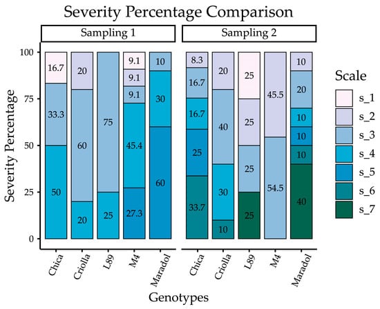 | 7 | 51–75 | Speckled yellow areas cover 51–75% of the leaf area, with clear evidence of rings throughout the fruit bruises or streaks on petioles and stems. | Moderately susceptible |