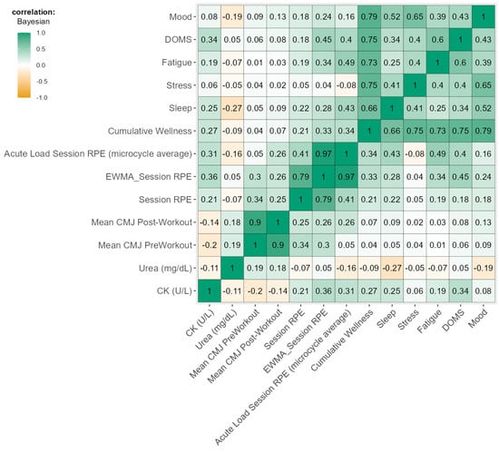 Spearman correlation analysis revealed significant associations between physiological and perceptual markers. CK levels showed moderate positive correlations with session-RPE (ρ = 0.229, p = 0.043), its EWMA (ρ = 0.346, p = 0.002), and muscle soreness (ρ = 0.386, p < 0.001). CK also showed a significant but small correlation with sleep (ρ = 0.25, p < 0.05). CMJ performance (pre/post) was strongly correlated (ρ = 0.831, p < 0.001) but inversely related to urea (post: ρ = 0.242, p = 0.031). Mood correlated most strongly with cumulative wellness score (ρ = 0.817, p < 0.001). A Bayesian correlation matrix for the study variables is shown in Figure 1. The full correlations are presented in Supplementary File S1.
